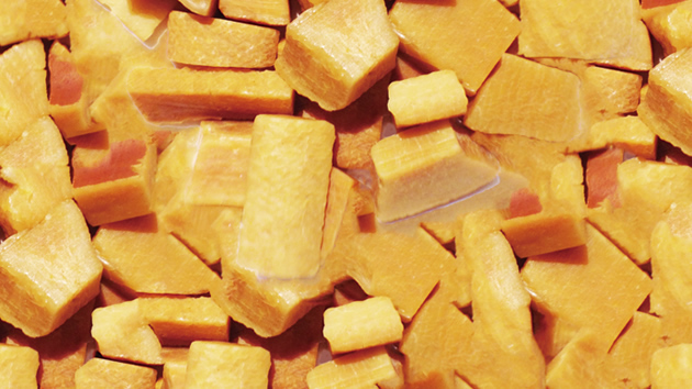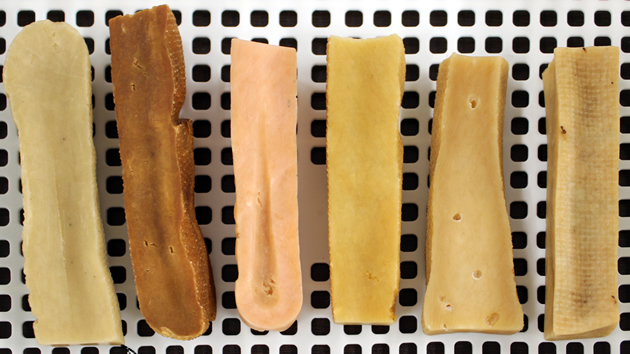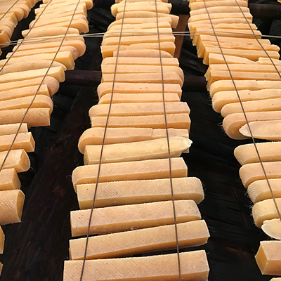 この地域の人々に伝わる伝統的な保存食であるチーズを愛犬用に燻製(スモーク)・乾燥させて切り出しました。しっかりと熟成乾燥されているため、チーズ本来の香りと味が凝縮され、骨のような硬さになり、無添加でも長期保存が可能になっています。