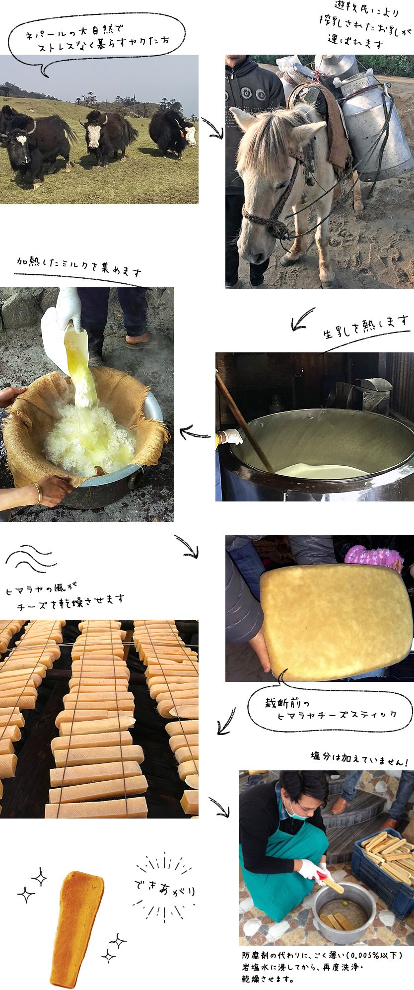 ヒマラヤチーズは、ネパール、ヒマラヤ山脈の高地で、農薬は一切使わない自然の牧草を食べて育ったヤクや、ヤクと牛が自然交配して生まれたヤク牛のミルクで作られています。